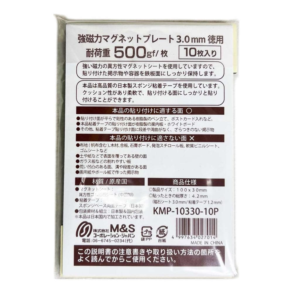 ●耐荷重500gf/枚 ●マグネットの厚み3mm ●材質:異方性ゴム磁石、スポンジベース両面テープ ●入数:10枚 ●色:黒 ●貼り付けに適する面:樹脂製のペン立て、ポストカード入れ、ホワイトボード、その他粘着テープ貼り付け面に段差や湾曲がなく、ざらつきのない掲示物