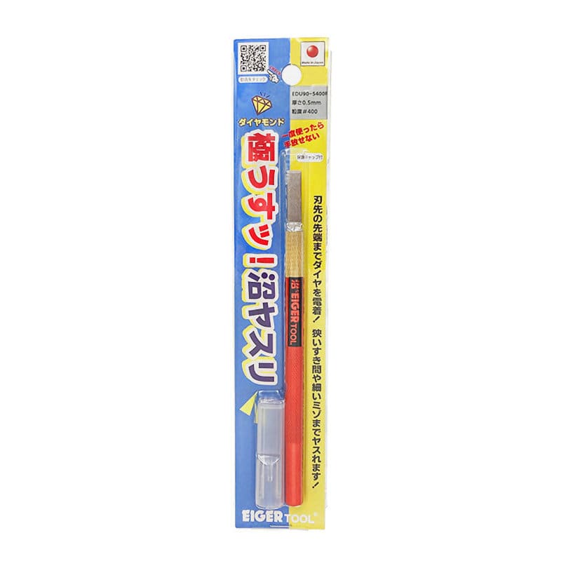 【用途】 精密作業・模型製作などの狭いすき間や溝の研磨 【特徴】 ●刃先角度90度のナイフタイプ ●平面(側面)でもヤスリがけできる ●電着ダイヤヤスリで金属にも使える ●ヤスリ芯材:鋼材 ヤスリ砥粒材:ダイヤモンド ●刃厚:0.5mm ●刃角度90° ●粒度:♯400