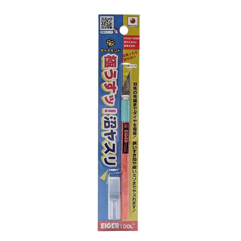 【用途】 精密作業・模型製作などの狭いすき間や溝の研磨 【特徴】 ●刃先角度22度のナイフタイプ ●平面(側面)でもヤスリがけできる ●電着ダイヤヤスリで金属にも使える ●ヤスリ芯材:鋼材 ヤスリ砥粒材:ダイヤモンド ●刃厚:0.5mm ●刃角度22° ●粒度:♯600