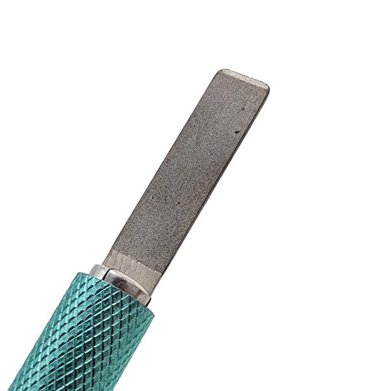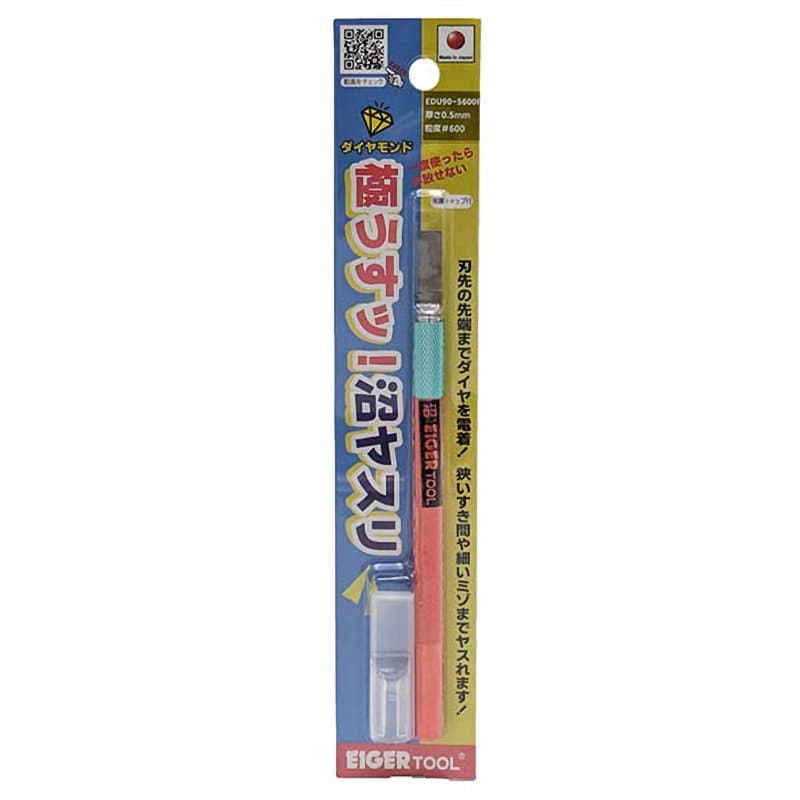 【用途】 精密作業・模型製作などの狭いすき間や溝の研磨 【特徴】 ●刃先角度90度のナイフタイプ ●平面(側面)でもヤスリがけできる ●電着ダイヤヤスリで金属にも使える ●ヤスリ芯材:鋼材 ヤスリ砥粒材:ダイヤモンド ●刃厚:0.5mm ●刃角度90° ●粒度:♯600