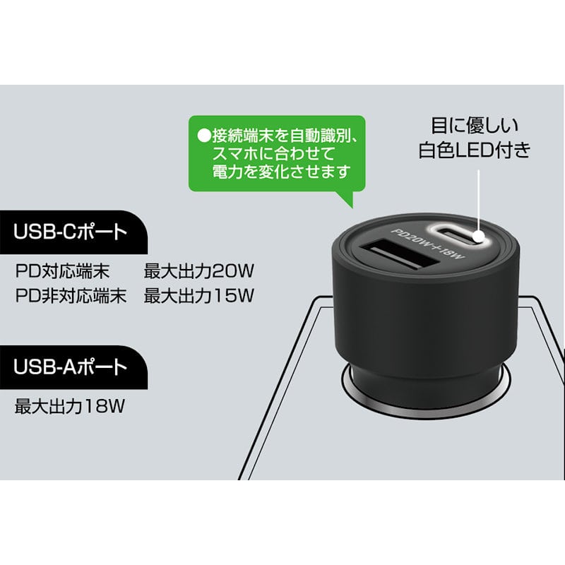 ●車のDCソケットをUSB-AとType-Cの2ポートのUSB電源に変換 ●コンパクト設計 ●USB PD(Power Delivery)対応USB Type-Cポート:最大20W 出力自動切替 5V 3A, 9V 2.22A, 12V 1.67A ※PD充電はPD対応のケーブルが必要です。 ※USB PD規格に非対応の端末を接続した場合は5V出力になります。 ●クイックチャージ3.0対応USB-Aポート:最大18W 出力自動切替 5V 3A, 9V 2A, 12V 1.5A 自動識別IC搭載、端末に合わせて最適に充電 ●2ポート同時使用時:合計最大38W出力(PD20W+QC18W) 2台の端末を同時に高速充電できます。 ●通電確認用Type-Cポートに白色LED付き。 ●12V/24V車兼用
