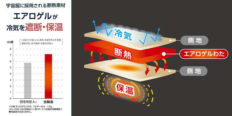 宇宙服に採用される断熱素材「エアロゲル」が、外からの冷気を遮断し、布団内の熱を保温することで羽毛のようなあたたかさを実現!!