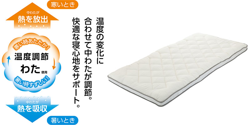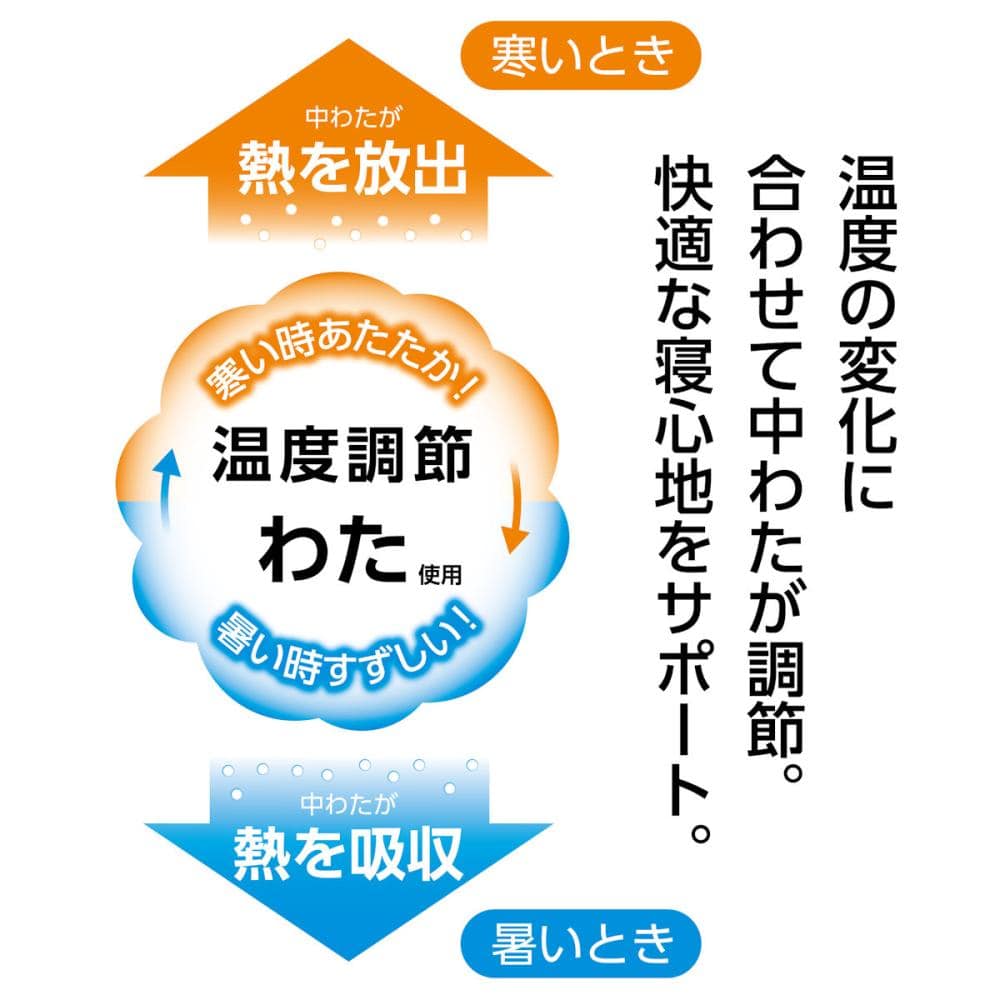 温度の変化に合わせて中わたが温度を調節するので、これ1枚で1年中快適な寝心地。