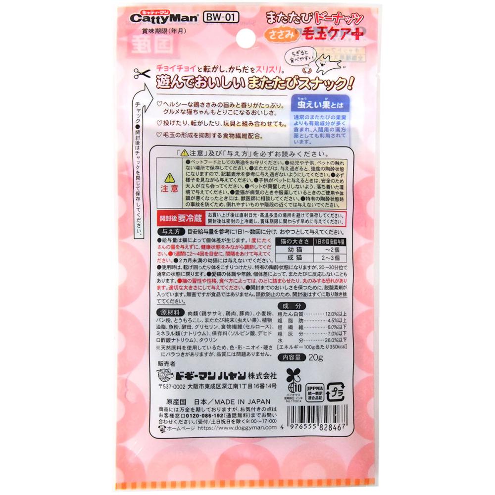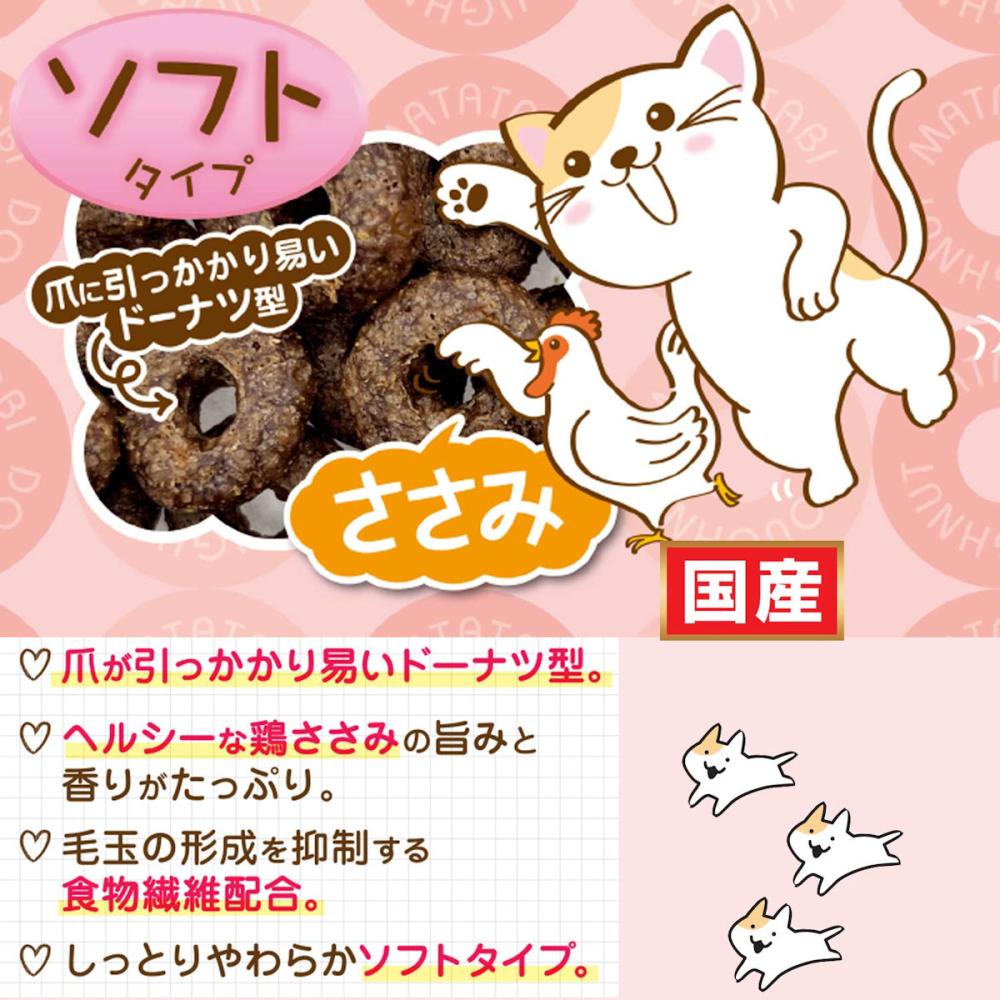 原材料・成分:肉類(鶏ササミ、鶏肉、豚肉)、小麦粉、パン粉、とうもろこし、またたび純末(虫えい果)、植物油脂、魚粉、酵母、グリセリン、食物繊維(セルロース)、ミネラル類(ナトリウム)、保存料(ソルビン酸、デヒドロ酢酸ナトリウム)、タウリン