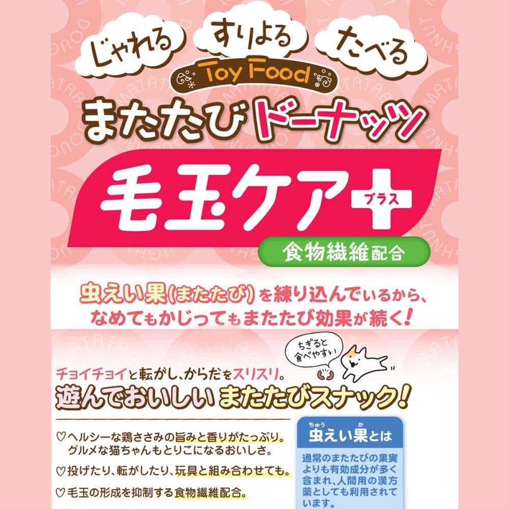 虫えい果(またたび)を練りこんでいるから、なめてもかじってもまたたび効果が続く。遊んで食べられるToy Food。