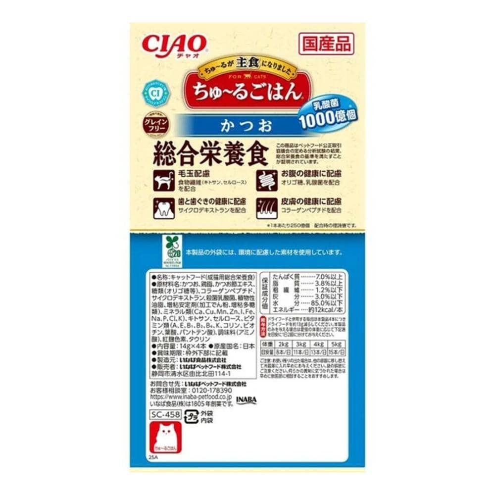 原材料・成分:かつお、鶏脂、かつお節エキス、糖類(オリゴ糖等)、コラーゲンペプチド、殺菌乳酸菌、サイクロデキストラン、植物性油脂、増粘安定剤(加工でん粉、増粘多糖類)、ミネラル類(Ca、Cu、Mn、Zn、I、Fe、Na、P、Cl、K)、キトサン、セルロース、ビタミン類(A、E、B1、B2、B6、K、コリン、ビオチン、葉酸)、調味料(アミノ酸)、紅こうじ色素、タウリン