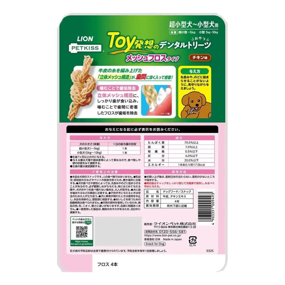 ●牛皮の糸を編み上げた立体メッシュ構造が歯間に入り、噛むことで歯垢を除去。