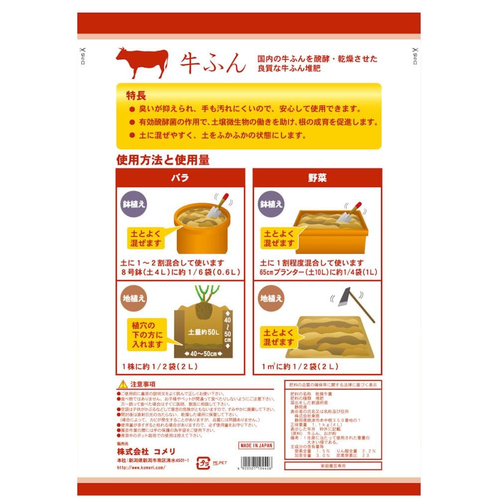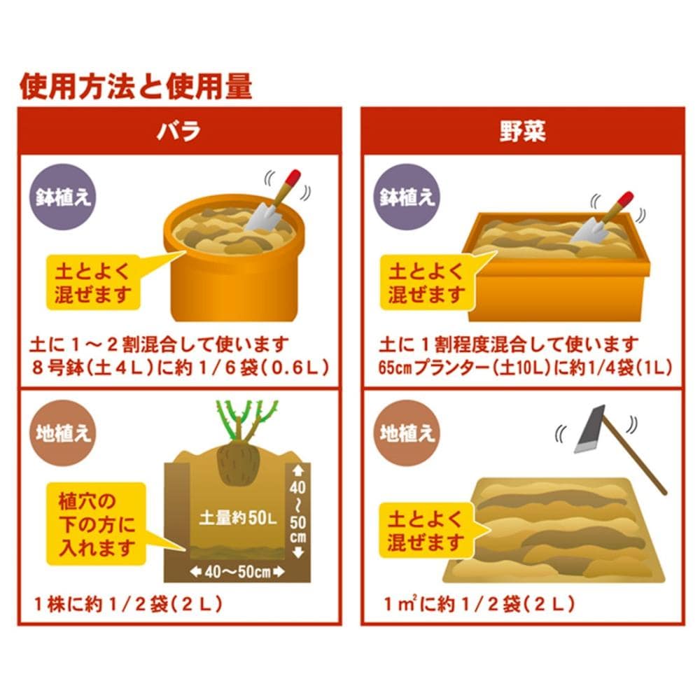 ●臭いが抑えられ、手も汚れにくいので、安心して使用できます。 ●有効醗酵菌の作用で、土壌微生物の働きを助け、根の生育を促進します。 ●土に混ぜやすく、土をふかふかの状態にします。