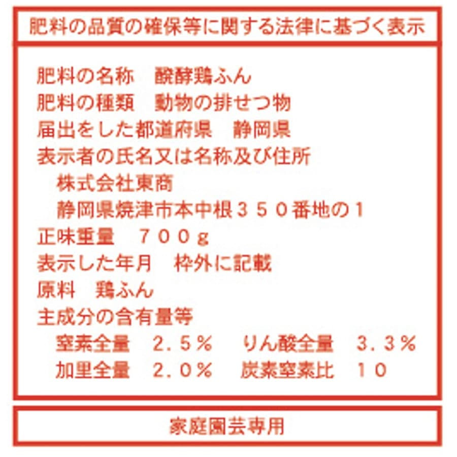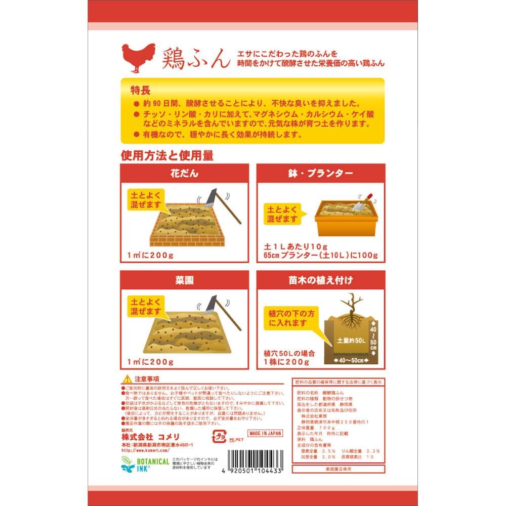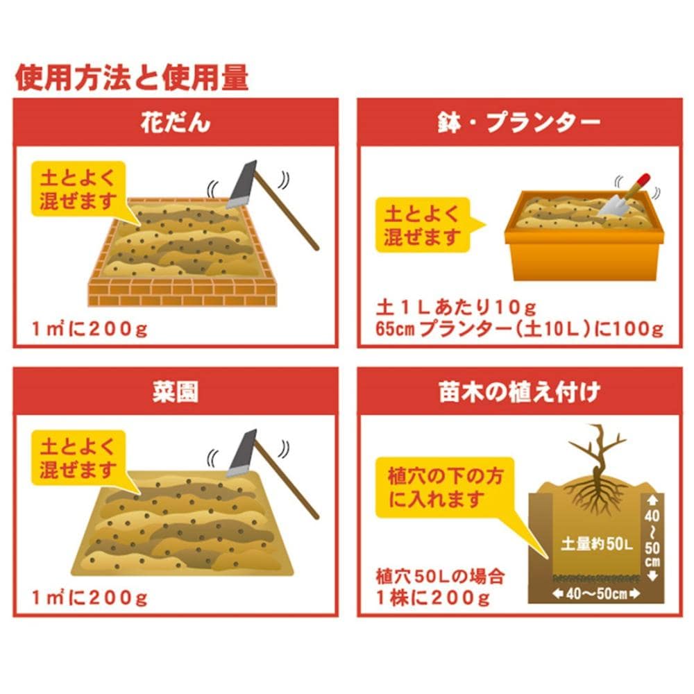 ●約90日間、醗酵させることにより、不快な臭いを抑えました。 ●チッソ・リン酸・カリに加えて、マグネシウム・カルシウム・ケイ酸などの ミネラルを含んでいますので、元気な株が育つ土を作ります。 ●粒状なので、穏やかに長く効果が持続します。 【肥料の与え方】 ●菜園・花だん・・・土とよく混ぜます。 1平方メートル当り:200g ●鉢&プランター・・・土とよく混ぜます。 土1L当り:10g、65cmプランター:100g ●苗木の植え付け・・・植穴の下の方に入れます。 土50L当り:200g