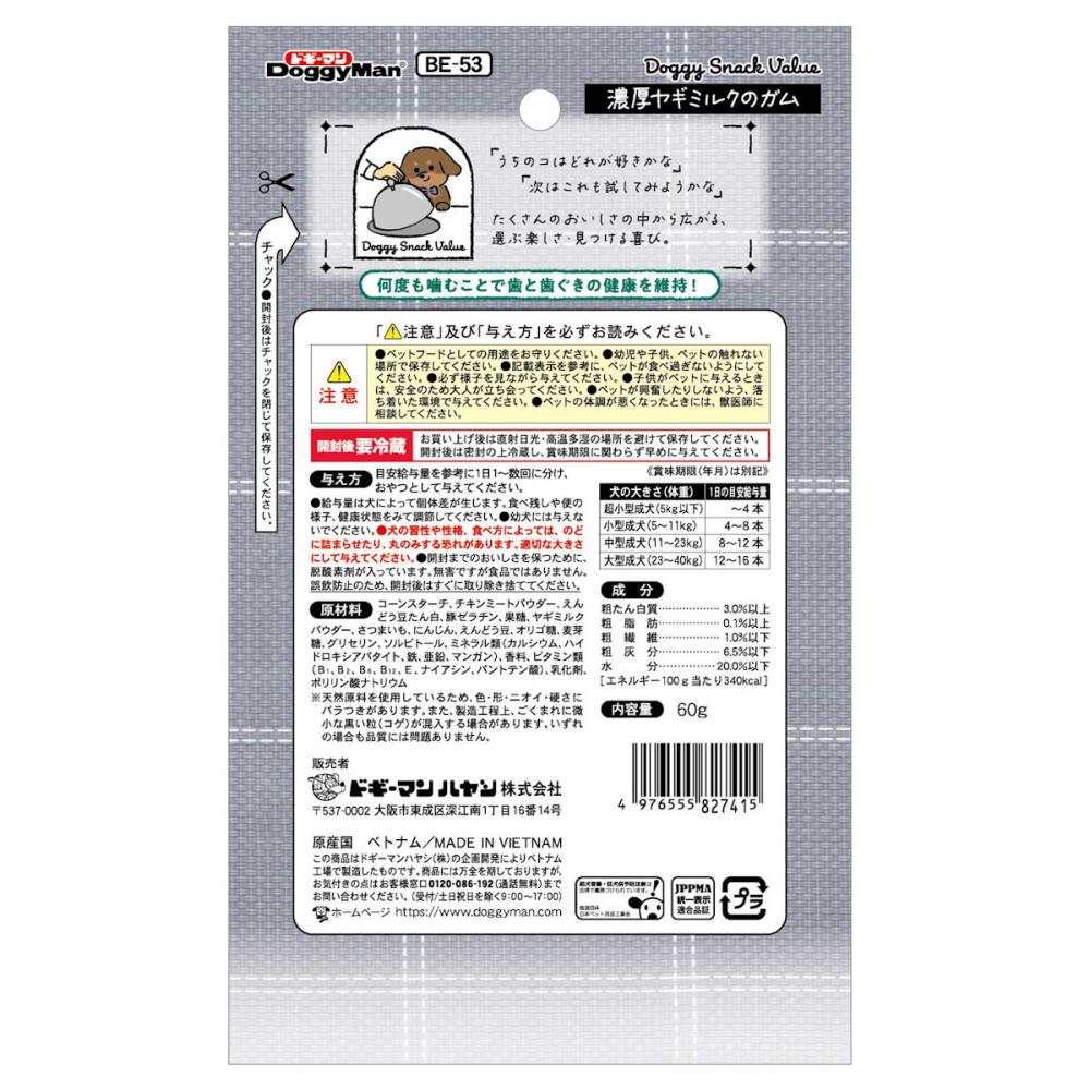 原材料・成分:コーンスターチ、チキンミートパウダー、えんどう豆たん白、豚ゼラチン、果糖、ヤギミルクパウダー、さつまいも、にんじん、えんどう豆、オリゴ糖、麦芽糖、グリセリン、ソルビトール、ミネラル類(カルシウム、ハイドロキシアパタイト、鉄、亜鉛、マンガン)、香料、ビタミン類(B1、B2、B6、B12、E、ナイアシン、パントテン酸)、乳化剤、ポリリン酸ナトリウム
