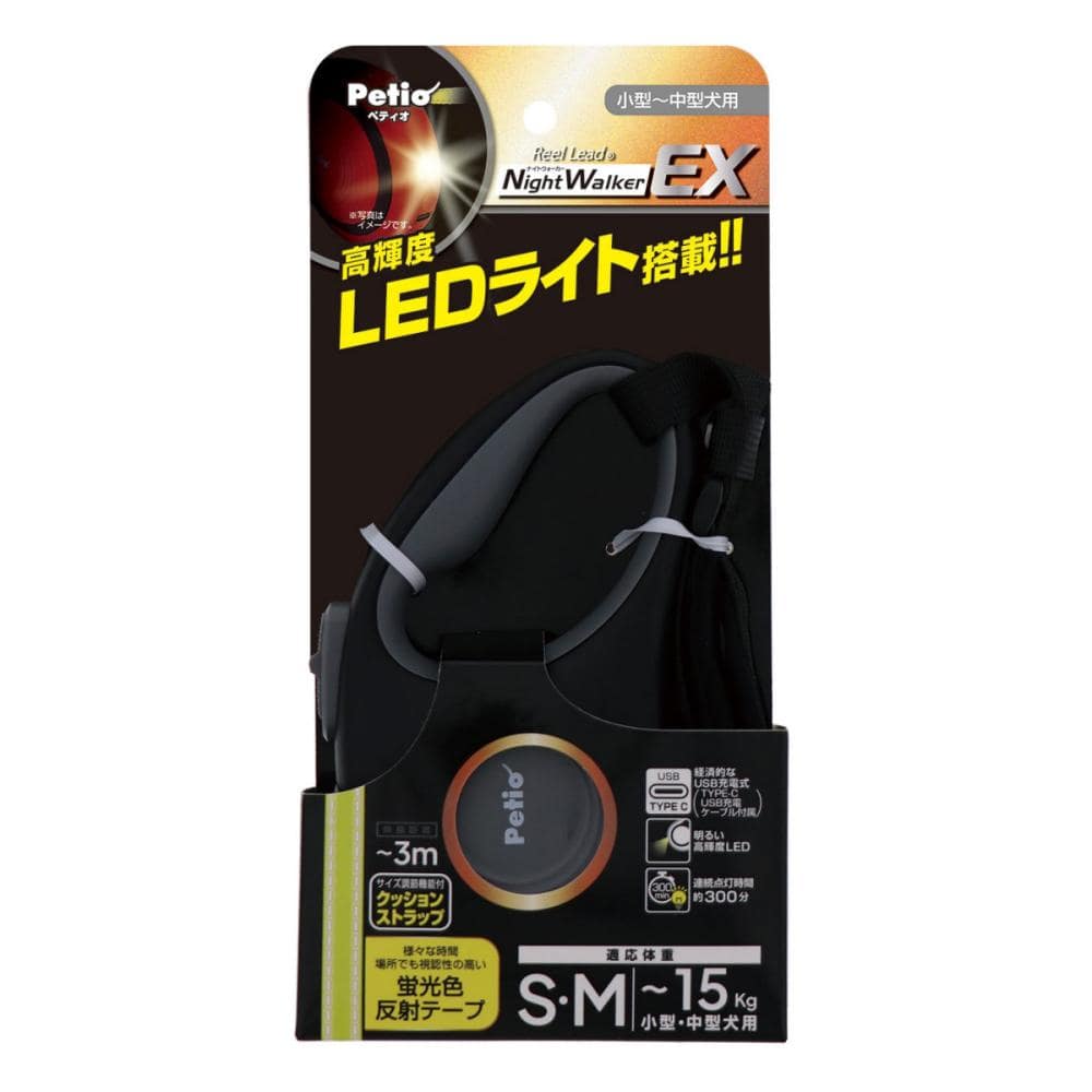 超高輝度LEDライト※1を搭載した伸縮式リード。視認性が高い反射材入り蛍光テープを採用しているので、薄暗い時間帯や夜間の散歩に便利!