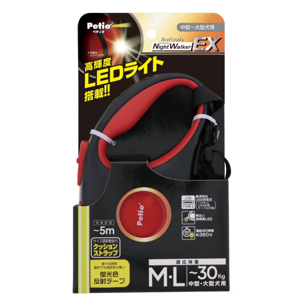 超高輝度LEDライト※1を搭載した伸縮式リード。視認性が高い反射材入り蛍光テープを採用しているので、薄暗い時間帯や夜間の散歩に便利!