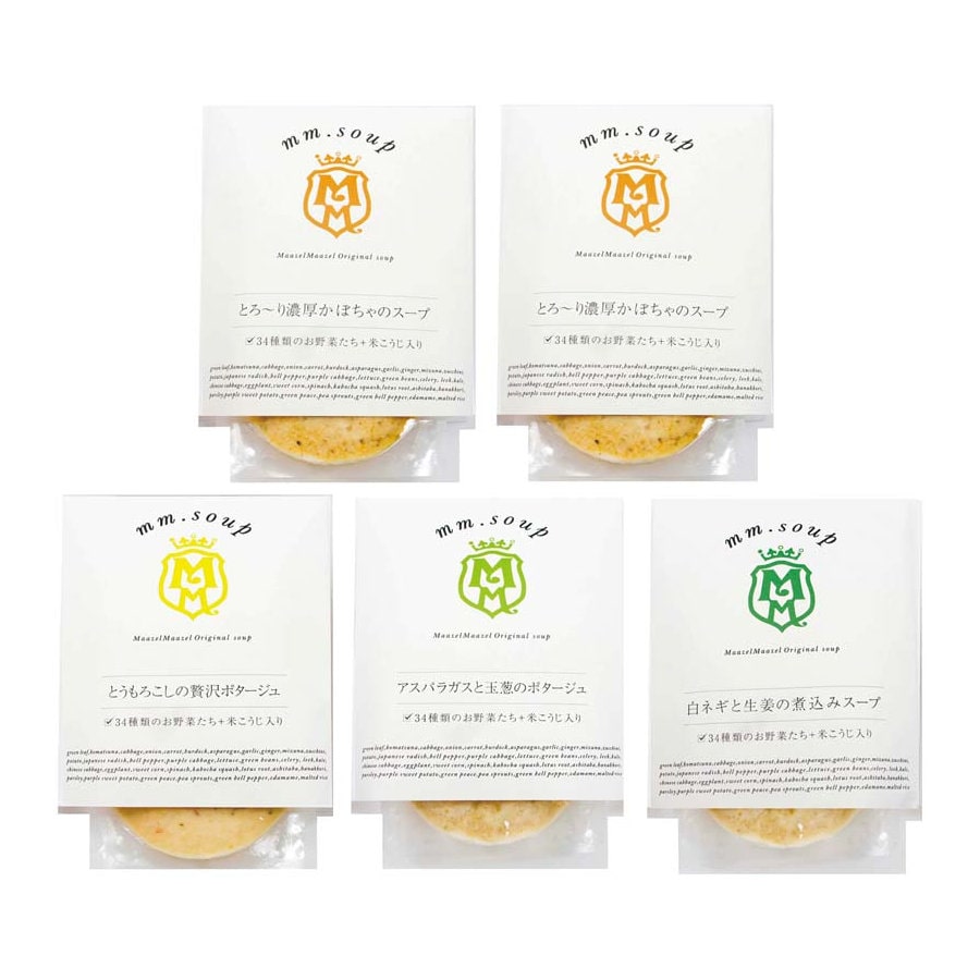【セット内容】とろーり濃厚かぼちゃのスープ180g×2、とうもろこしの贅沢ポタージュ、アスパラガスと玉葱のポタージュ、白ネギと生姜の煮込みスープ各180g