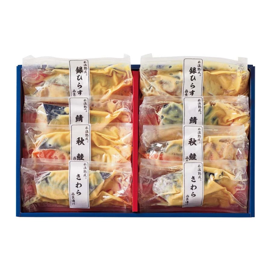 【セット内容】銀ひらす西京漬け60g×2、鯖西京漬け60g×2、秋鮭西京漬け60g×2、さわら西京漬け70g×2