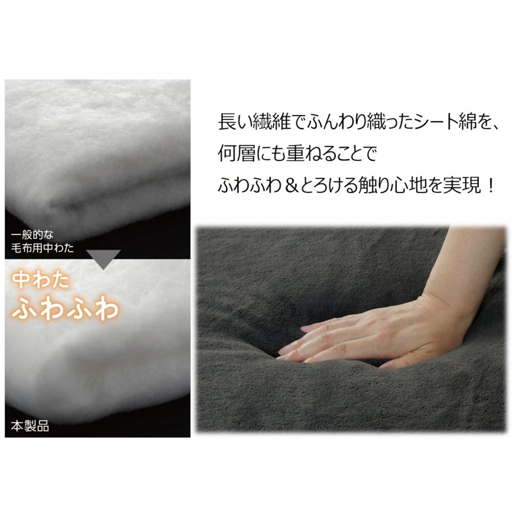 一般的な毛布用中わたは、細かい繊維をギュッと固めてつくりますが、本製品は長い繊維でふんわり織ったシートわたを、何層にも重ねることでふわふわ&なめらかな触感を実現!いつまでも触れていたくなる心地よさです。