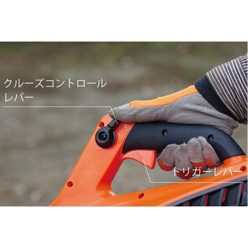 【ブロワ本体のみ】※バッテリーは付属しません。 ・本体質量:1.9kg(バッテリー未装着) ・最大風量(m3/min):通常10.3 ターボモード11.4 ・最大風速(m/sec):通常45.8 ターボモード50.6 ●ECHOオリジナルの36Vリチウムイオンバッテリー用ブロワ ●軽快なモーター駆動で「低振動」「低騒音」「排ガスゼロ」。負荷やストレスの少ないスマートな作業が実現できます。 ●スイッチオンで簡単起動。エンジンタイプのような始動に関わる煩雑な操作が不要です。 ●R型形状直噴管:先端をR形状にしているため、風を絞り風速を確保します。 ●ターボモード搭載:瞬間的に風量が上がりますので、地面に張り付いてしまった落ち葉も勢いよく吹き飛ばせます。 ●クルーズコントロール:トリガー操作はもちろん、任意の風量を固定できるため連続作業時に最適です。 ●多面インテーク:作業者の服が張り付くことによる風量ロスが少なく、作業性の低下はありません。 ●別売のECHO36Vバッテリーシリーズのチェンソー・ヘッジトリマー等と同じバッテリーを使用します。