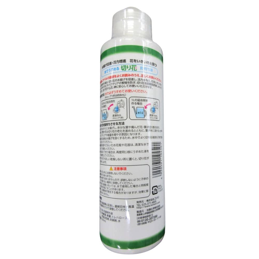 切り花長持ち液は、切り花の水揚げを促進し、活力を与え、花をいきいきと保ち、水中のカビやバクテリアの繁殖を防ぎ、切り花を長期間お楽しみいただけます。生け花や仏花、榊に安心してお使いいただけます。
