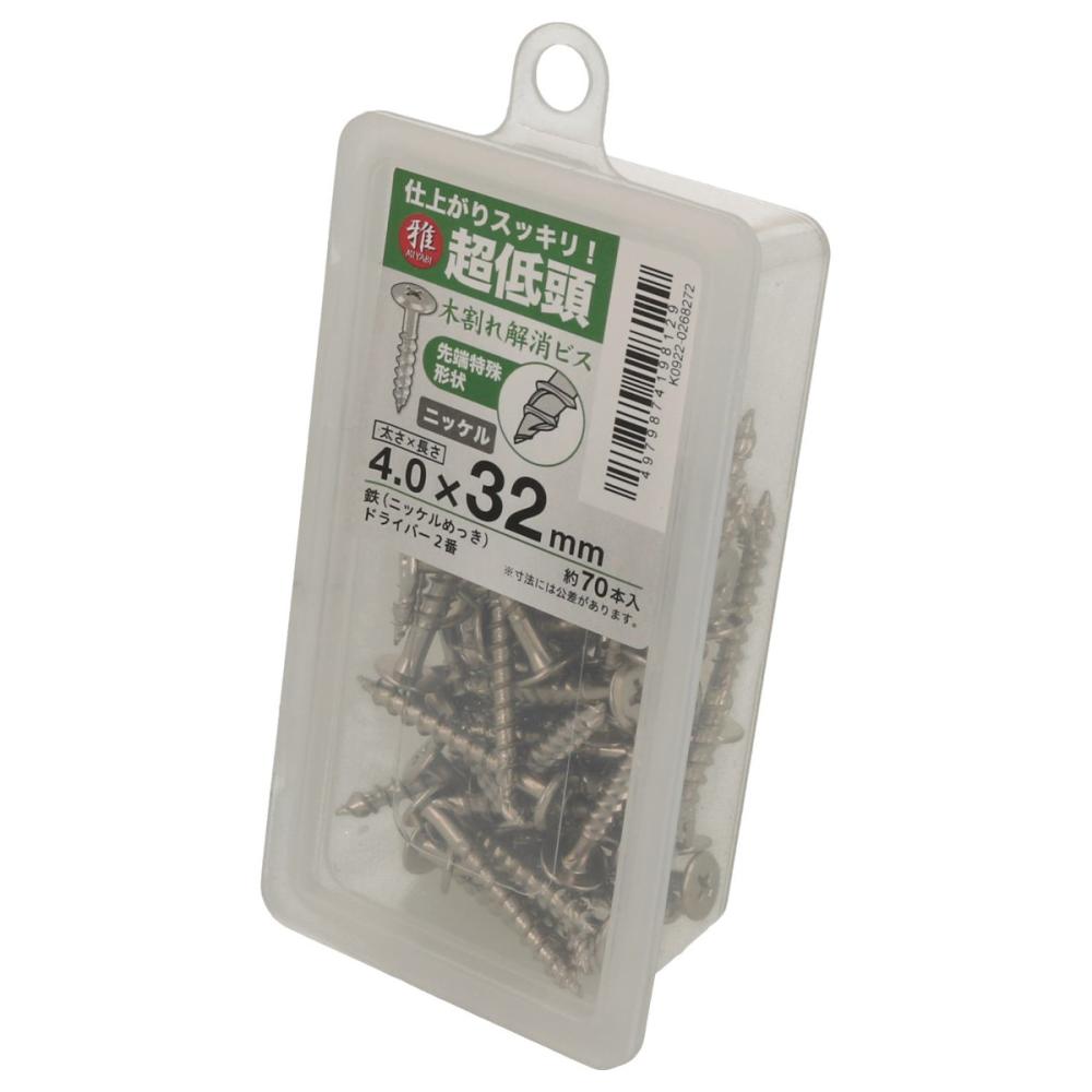 ●寸法:4.0mm ●適合ドライバー:2番 ●表面処理:ニッケルめっき ●刃先:特殊形状 ●頭径:9mm ●頭高さ:1.2mm