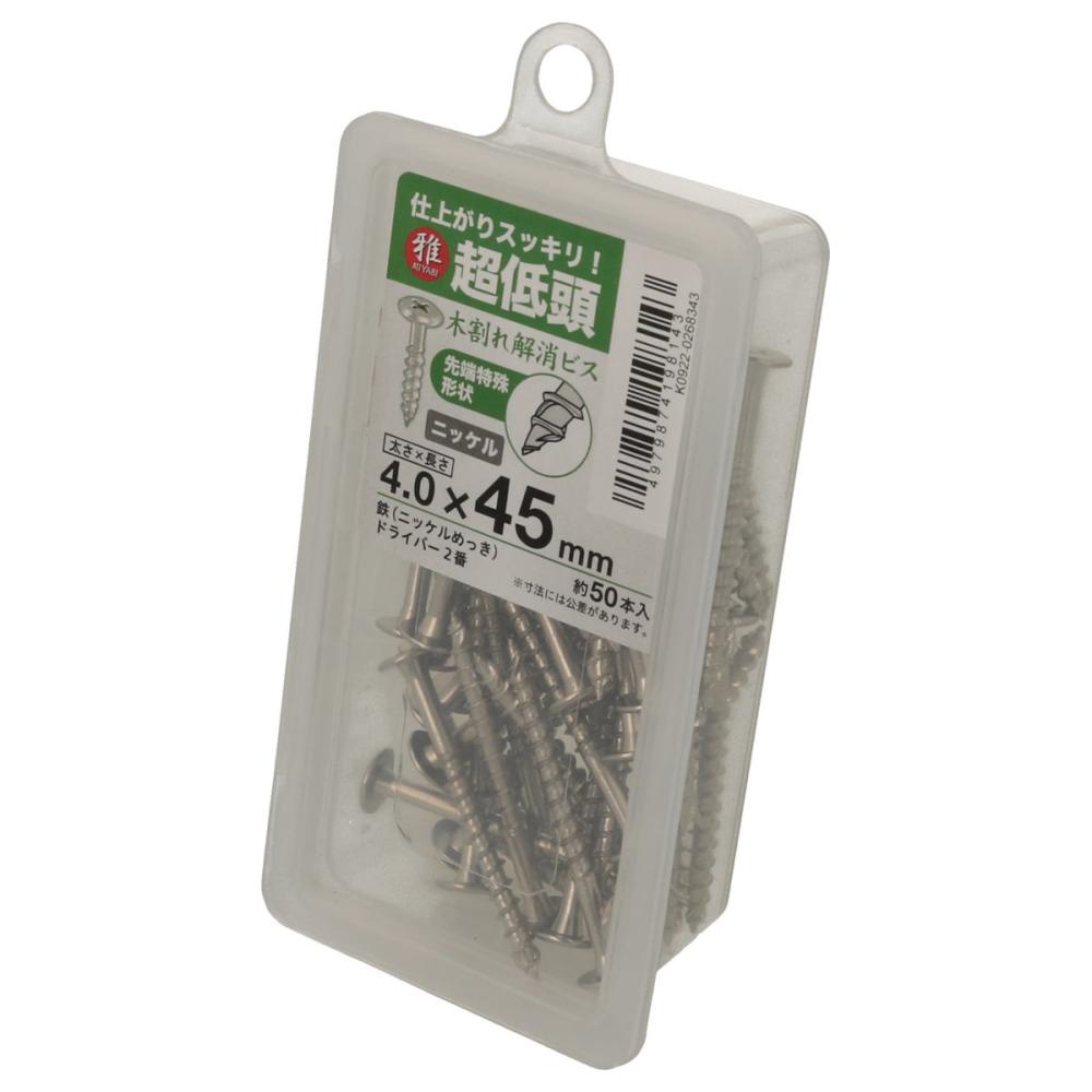 ●寸法:4.0mm ●適合ドライバー:2番 ●表面処理:ニッケルめっき ●刃先:特殊形状 ●頭径:9mm ●頭高さ:1.2mm
