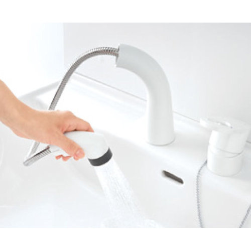 シンプルなデザインの引き出し式シャワー水栓。ヘッドの高さを変えられるリフトアップ機構付き。