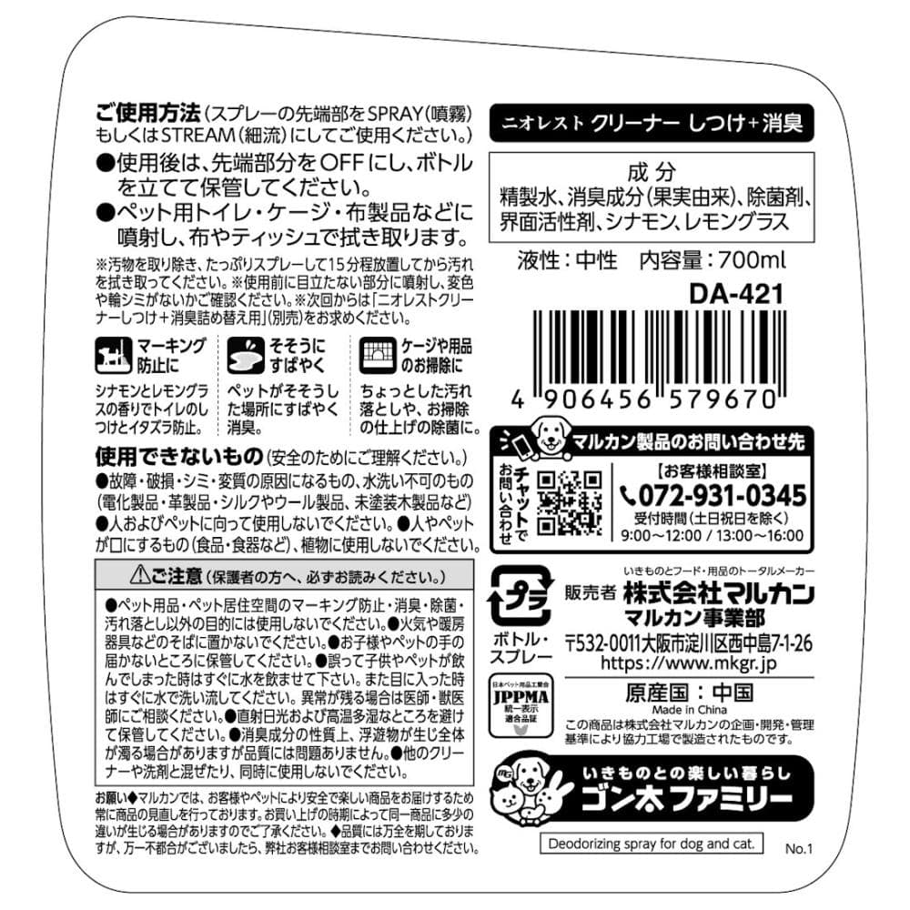お取り扱い上の注意:ペット用品・ペット居住空間の消臭・除菌・汚れ落とし以外の目的には使用しないでください。誤って子供やペットが飲んでしまった時はすぐに水を飲ませて下さい。また目に入った時はすぐに水で洗い流してください。異常が残る場合は医師・獣医師にご相談ください。消臭成分の性質上、浮遊物が生じ全体が濁る場合がありますが品質には問題ありません。他のクリーナーや洗剤と混ぜたり、同時に使用しないでください。