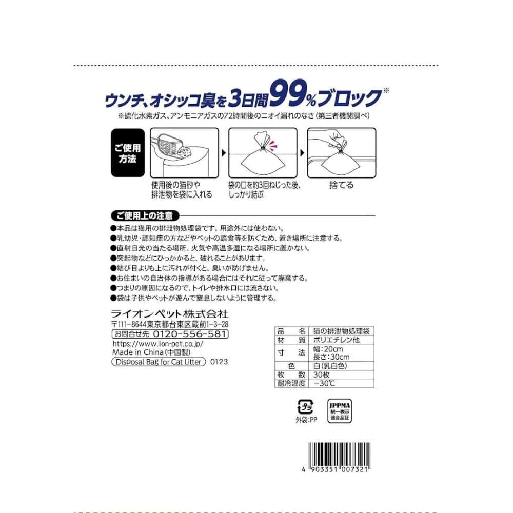 お取り扱い上の注意:本品は猫用の排泄処理袋です。用途外には使わない。突起物などにひっかかると、破れることがあります。結び目よりも上に汚れが付くと、臭いが防げません。お住まいの自治体の指導がある場合にはそれに従って廃棄する。つまりの原因になるので、トイレや排水口には流さない。袋は子供やペットが遊んで窒息しないように管理する。