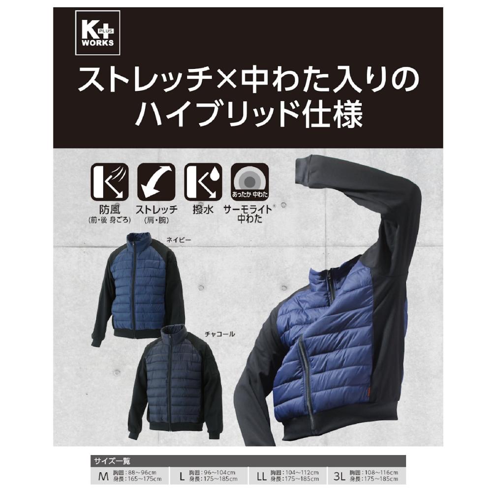 ●冷たい空気が入りづらい裾リブ ●便利な腕ペン差し ●防風(前・後 身ごろ) ●ストレッチ(肩・腕) ●撥水 ●サーモライト中綿 ●L(胸囲96~104cm 身長175~185cm) ●組成:表地・ポリエステル100% 中綿・ポリエステル100% 裏地・ポリエステル100% リブ・ポリエステル98%ポリウレタン2%