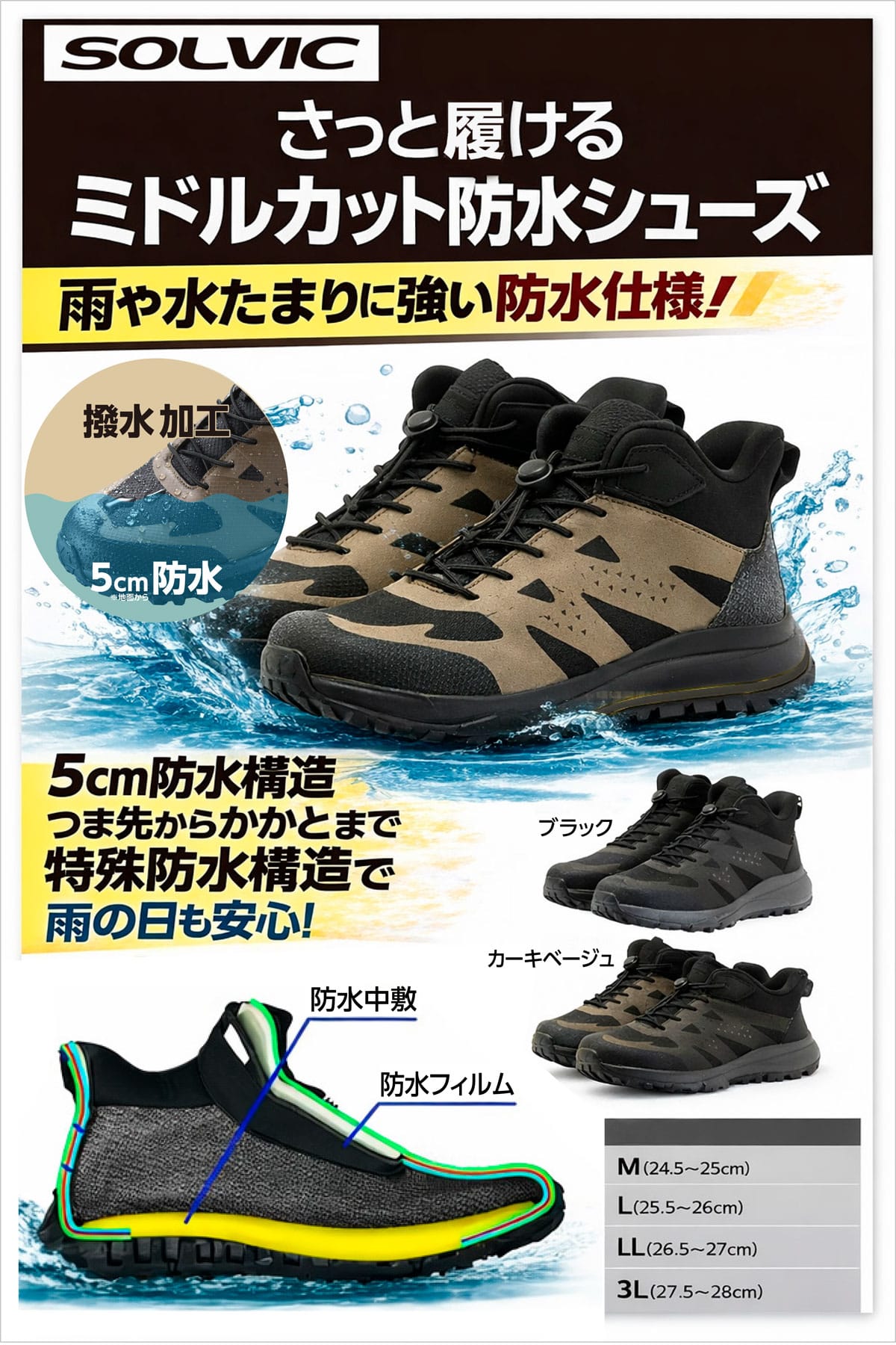 ●撥水加工(地面から5cm防水) ●ミッドソールはボリュームEVA素材使用でクッション性アップ ●アウトソールはTPE素材貼りで耐久性アップ ●L(25.5~26.0cm) ●材質:甲皮・ポリウレタン、ポリエステル 底材・合成底