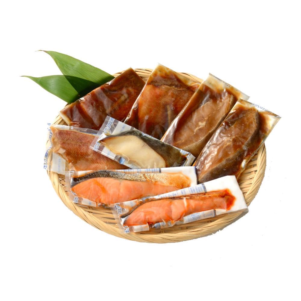 セット内容:(カラスガレイ煮魚1切、赤魚煮魚1切、それぞれ各2)、(銀鱈西京漬焼50g、赤魚味噌漬焼50g、銀鮭味噌漬焼50g、銀鮭甘塩漬焼50g、それぞれ各1)