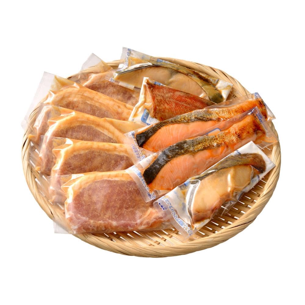 セット内容:銀鱈味噌漬焼50g×1、さわら味噌漬焼50g×1、赤魚味噌漬焼60g×1、銀鮭味噌漬焼60g×1、銀鮭甘塩漬焼60g×1、豚ロース味噌漬100g×5