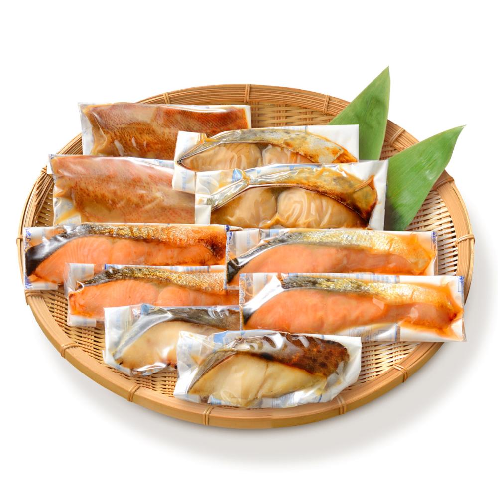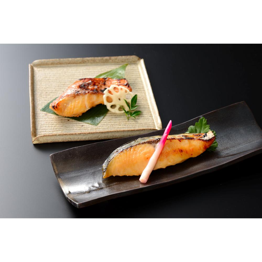 セット内容:銀鱈味噌漬焼50g、さわら味噌漬焼50g、赤魚味噌漬焼60g、銀鮭味噌漬焼60g、銀鮭甘塩漬焼60g、それぞれ各2