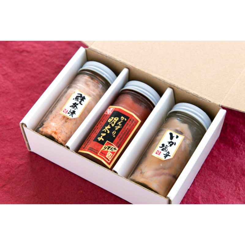 セット内容:かんずり明太子80g、鮭茶漬45g、いか塩辛70g
