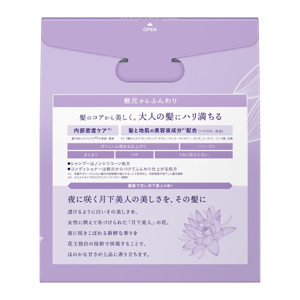 髪のコアから美しく。大人の髪にハリ満ちる。根元からふんわり。 ●内部密度ケア*1 髪内部にセラミドS*2が浸透・補修 ●髪と地肌の美容液成分配合(つや付与・保湿):6種のエキス(ローズヒップ、ザクロ、バラ、ローヤルゼリー、ダイズ、ユーカリ)、リンゴ酸、乳酸 ●優雅で甘い月下美人の香り *1髪内部を補修 *2ビスメトキシプロピルアミドイソドコサン(補修)