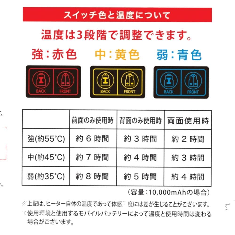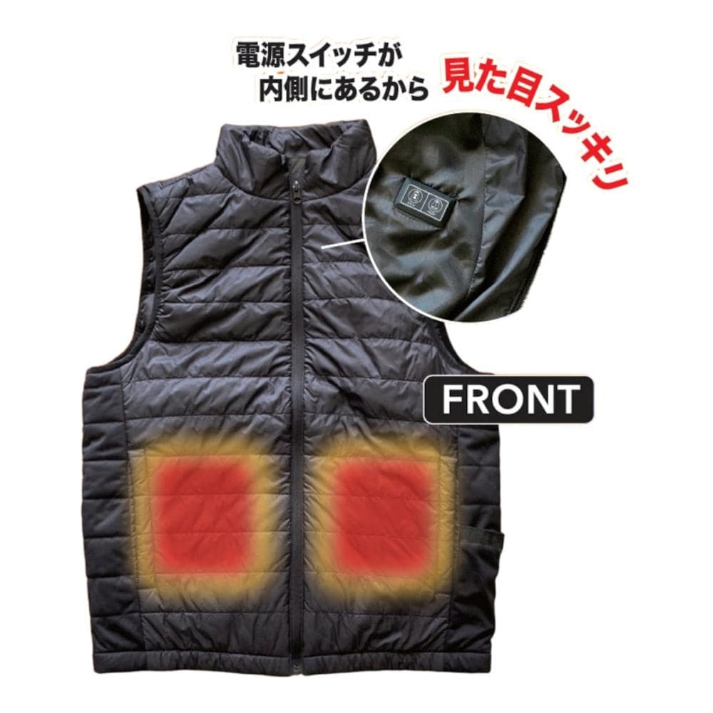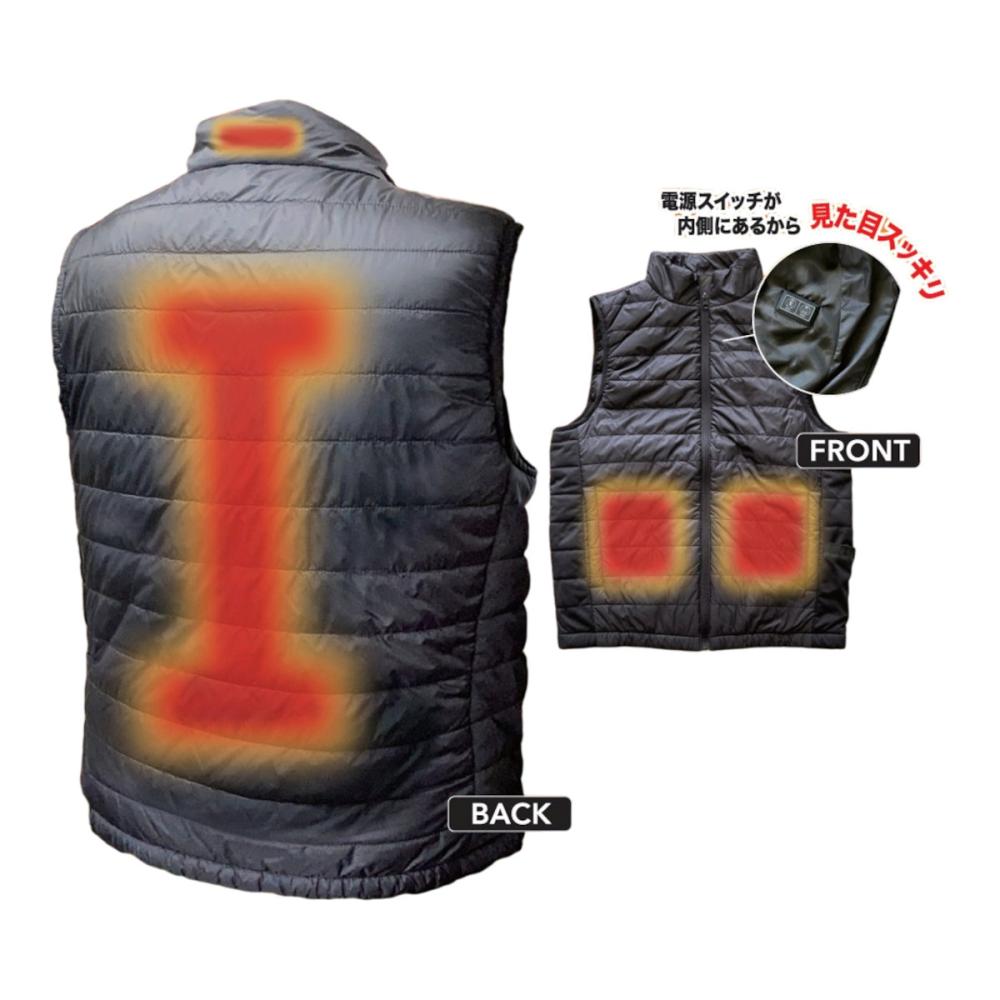 ●背中・お腹・エリまで丸ごと発熱! ●体に密着するI型ヒーター ●電源スイッチが内側にあるから見た目スッキリ ●モバイルバッテリー別売 ●使用可能バッテリー:出力電圧5V/電流2.0Ah以上のモバイルバッテリーをご使用ください。(接続端子USB Type-A) ●洗濯可能 ●温度は3段階で調整ができます。(強:約55℃/中:約45℃/弱:約35℃) ●材質:本体表地・ナイロン100%、表地切り替え・ポリエステル100%、中綿・ポリエステル100%、裏地・ポリエステル100%