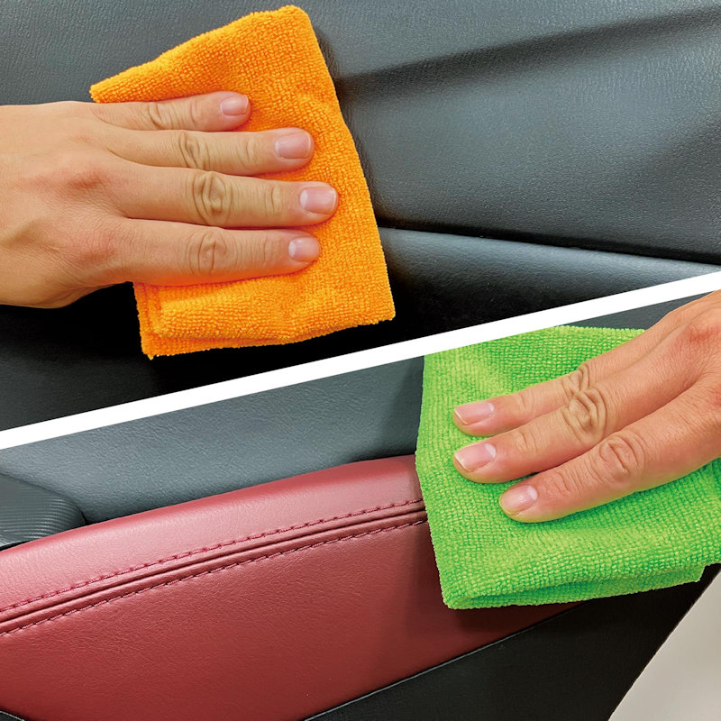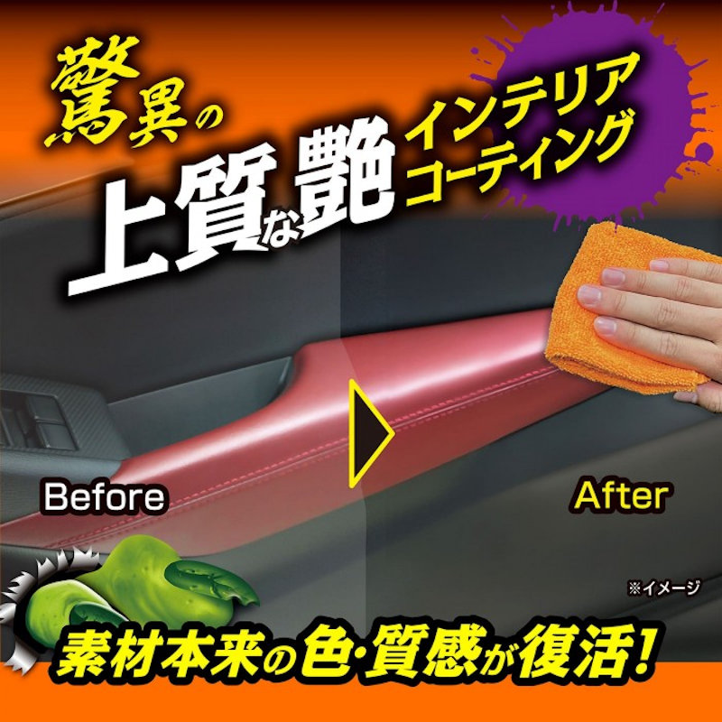 新車時のような素材本来の色・質感・艶を与える2種類の艶出し成分を配合し、ムラになりにくく、ギラつかないサラッとした仕上がりになります。 また、紫外線による色褪せや劣化を防ぐUV吸収剤に加え、ホコリや手アカ汚れが付きにくい耐久コーティング効果により、キレイな状態を維持します。さらに、石油系溶剤不使用で素材に優しい中性タイプ。