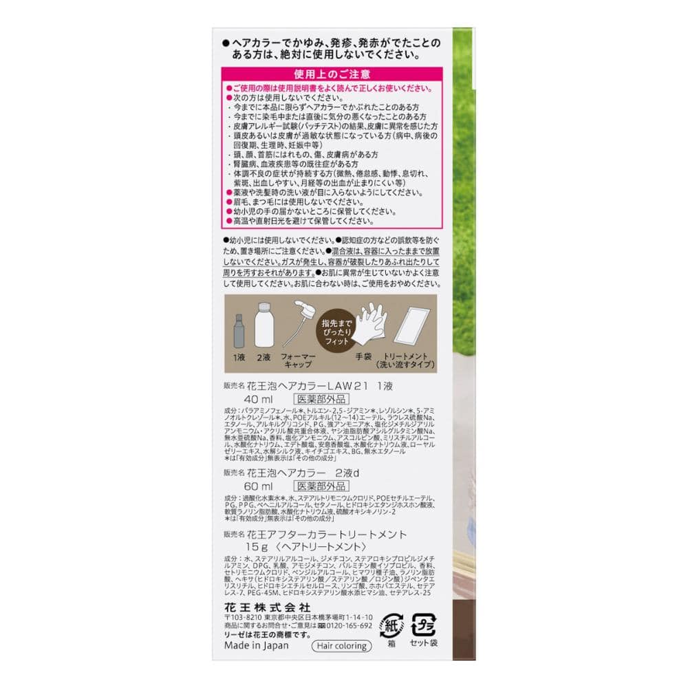 原材料・成分:花王泡ヘアカラーLAW21 1液 成分:パラアミノフェノール*、トルエン-2,5-ジアミン*、レゾルシン*、5-アミノオルトクレゾール*、水、POEアルキル(12~14)エーテル、ラウレス硫酸Na、エタノール、アルキルグリコシド、PG、強アンモニア水、塩化ジメチルジアリルアンモニウム・アクリル酸共重合体液、ヤシ油脂肪酸アシルグルタミン酸Na、無水亜硫酸Na、香料、塩化アンモニウム、アスコルビン酸、ミリスチルアルコール、水酸化ナトリウム、エデト酸塩、安息香酸塩、水酸化ナトリウム液、ローヤルゼリーエキス、水解シルク液、キイチゴエキス、BG、無水エタノール *は「有効成分」無表示は「その他の成分」 花王泡ヘアカラー 2液d 成分:過酸化水素水*、水、ステアルトリモニウムクロリド、POEセチルエーテル、PG、PPG、ベヘニルアルコール、セタノール、ヒドロキシエタンジホスホン酸液、軟質ラノリン脂肪酸、水酸化ナトリウム液、硫酸オキシキノリン-2 *は「有効成分」無表示は「その他の成分」 花王アフターカラートリートメント 成分:水、ステアリルアルコール、ジメチコン、ステアロキシプロピルジメチルアミン、DPG、乳酸