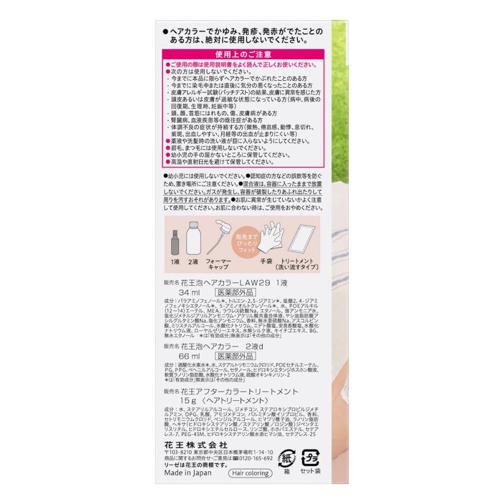 原材料・成分:花王泡ヘアカラーLAW29 1液 成分:パラアミノフェノール*、トルエン-2,5-ジアミン*、塩酸2,4-ジアミノフェノキシエタノール*、5-アミノオルトクレゾール*、水、POEアルキル(12~14)エーテル、MEA、ラウレス硫酸Na、エタノール、強アンモニア水、塩化ジメチルジアリルアンモニウム・アクリル酸共重合体液、ヤシ油脂肪酸アシルグルタミン酸Na、塩化アンモニウム、香料、無水亜硫酸Na、アスコルビン酸、ミリスチルアルコール、水酸化ナトリウム、エデト酸塩、安息香酸塩、水酸化ナトリウム液、ローヤルゼリーエキス、水解シルク液、キイチゴエキス、BG、無水エタノール *は「有効成分」無表示は「その他の成分」 花王泡ヘアカラー 2液d 成分:過酸化水素水*、水、ステアルトリモニウムクロリド、POEセチルエーテル、PG、PPG、ベヘニルアルコール、セタノール、ヒドロキシエタンジホスホン酸液、軟質ラノリン脂肪酸、水酸化ナトリウム液、硫酸オキシキノリン-2 *は「有効成分」無表示は「その他の成分」 花王アフターカラートリートメント 成分:水、ステアリルアルコール、ジメチコン、ステアロキシプロピルジメチルアミン、