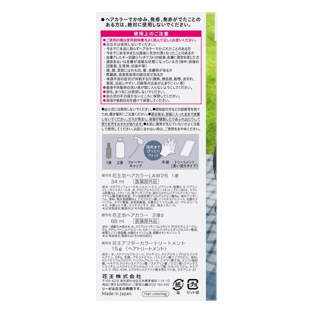 原材料・成分:花王泡ヘアカラーLAW26 1液 成分:メタアミノフェノール*、トルエン-2,5-ジアミン*、塩酸2,4-ジアミノフェノキシエタノール*、水、POEアルキル(12~14)エーテル、MEA、ラウレス硫酸Na、エタノール、強アンモニア水、塩化ジメチルジアリルアンモニウム・アクリル酸共重合体液、ヤシ油脂肪酸アシルグルタミン酸Na、塩化アンモニウム、香料、無水亜硫酸Na、アスコルビン酸、ミリスチルアルコール、水酸化ナトリウム、エデト酸塩、安息香酸塩、水酸化ナトリウム液、ローヤルゼリーエキス、水解シルク液、キイチゴエキス、BG、無水エタノール *は「有効成分」無表示は「その他の成分」 花王泡ヘアカラー 2液d 成分:過酸化水素水*、水、ステアルトリモニウムクロリド、POEセチルエーテル、PG、PPG、ベヘニルアルコール、セタノール、ヒドロキシエタンジホスホン酸液、軟質ラノリン脂肪酸、水酸化ナトリウム液、硫酸オキシキノリン-2 *は「有効成分」無表示は「その他の成分」 花王アフターカラートリートメント 成分:水、ステアリルアルコール、ジメチコン、ステアロキシプロピルジメチルアミン、DPG、乳酸、アモジメチコン、