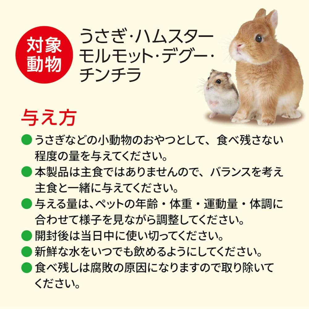 商品の利用(調理)方法:●うさぎなどの小動物のおやつとして、食べ残さない程度の量を与えてください。●本製品は主食ではありませんので、バランスを考え主食と一緒に与えてください。●与える量は、ペットの年齢・体重・運動量・体調に合わせて様子を見ながら調整してください。●開封後は当日中に使い切ってください。●新鮮な水をいつでも飲めるようにしてください。●食べ残しは腐敗の原因になりますので取り除いてください。