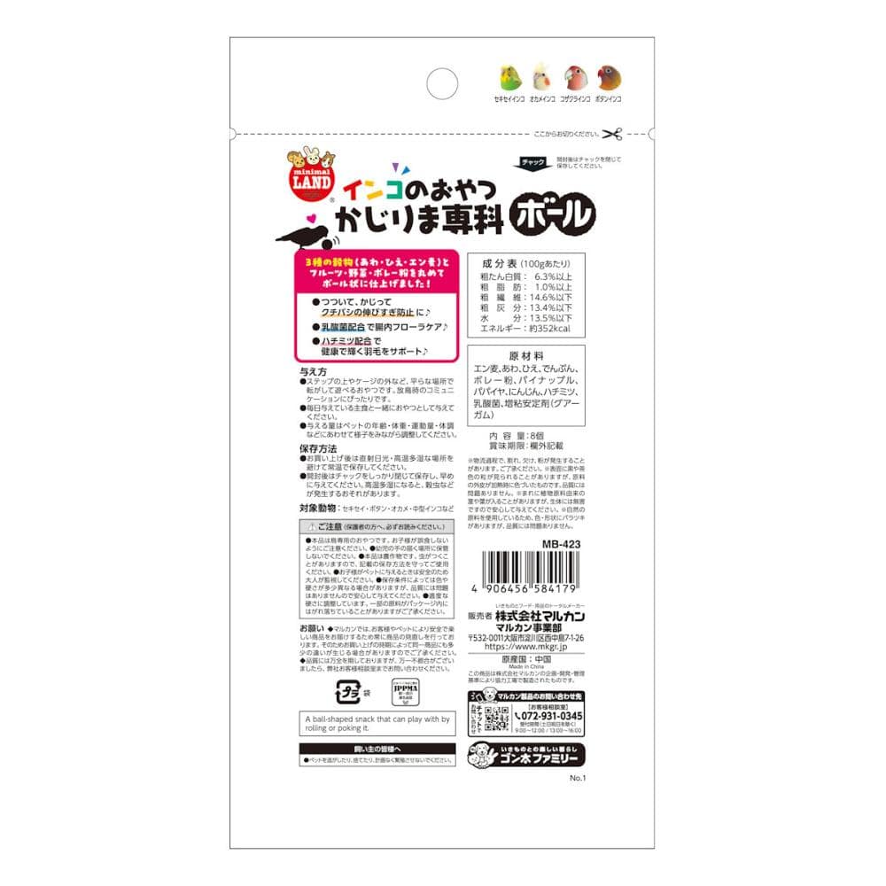 商品の利用(調理)方法:●ステップの上やケージの外など、平らな場所で転がして遊べるおやつです。放鳥時のコミュニケーションにぴったりです。●毎日与えている主食と一緒におやつとして与えてください。●与える量はペットの年齢・体重・運動量・体調などにあわせて様子をみながら調整してください。