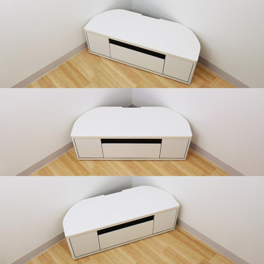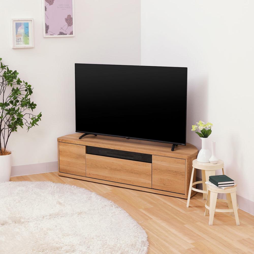 どんな角度でも設置できるコーナーテレビ台シリーズの『ロコインテ』。 シンプルさと丸みのあるデザインで、柔らかさと優しさを感じられる部屋を作ります。 背面の角が丸くなっているからどんな角度にも設置可能。 自由に角度調節して、リビングやダイニングなど部屋のどこからでもテレビが見やすくなります。 55V型までのテレビが置ける幅130cmなので、部屋の角を使って大型テレビを省スペースに設置できます。 ※お使いのテレビのサイズ・重量を必ずお確かめください。 DVDレコーダーや横置きゲーム機は、引き出し上の棚部分に収納できます。 引き出し上の棚部分はスモークガラス。収納したDVDレコーダーやゲーム機が見えにくくなり、すっきりとした印象になります。 引き出しには、DVDをタイトル面を上にして約43枚収納できます。 金属レールの引き出しのため、開閉が滑らかで耐久性にも優れています。 扉内には縦置きゲーム機やWi-Fiルーターを収納できます。 扉内は背板がない構造のため、DVDレコーダーやゲーム機などの排熱がこもりにくくなっています。 扉はプッシュ式で取っ手のないすっきりとしたデザイン。角の丸みが強調されて優しい印象を与えます。 天板には配線穴、背面には電源タップ収納付き。 これらを活用してコードを収納する事で、テレビ台裏の配線がすっきりとまとめられます。 キャスターが付いているので、お掃除や模様替えのときに簡単に動かせます。ストッパーで固定も可能です。 背面だけでなく、前面の角も丸みをもたせたデザインで柔らかさと優しさを感じられます。 扉や引き出しを開けると内側は黒木目。扉を開けたときや隙間からのぞく黒色が、高級感を与えます。 引き出しレールは工場取り付け済。組み立てのひと手間が減り、組立時間も短くなります。 また、組立簡単部品「フクイック」を使用した商品です。 あらかじめ取り付けてある部品に接着剤をつけてはめるだけなので、簡単に組み立てが可能です。 ※特許取得済み・商標登録済み