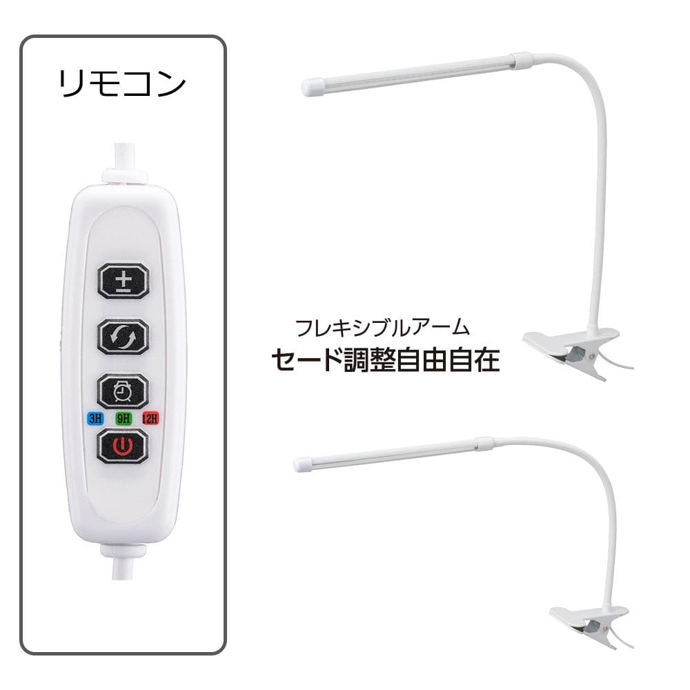 ■電源:5V 0.7A(MAX) ■消費電力:約3.5W(MAX) ■全光束:60ルーメン(赤色+青色100%点灯時) ■エネルギー消費効率:約17 lm/W ■照度:約4660ルクス(直下2.5cm/100%点灯時)、約2520ルクス(直下5cm/100%点灯時)、約1160ルクス(直下10cm/100%点灯時)、約410ルクス(直下20cm/100%点灯時) ■光合成光粒子束密度(PPFD) :約195マイクロmol/m2・S(直下2.5cm/100%点灯時)、約110マイクロmol/m2・S(直下5cm/100%点灯時)、約45マイクロmol/m2・S(直下10cm/100%点灯時)、約15マイクロmol/m2・S(直下20cm/100%点灯時) ■使用光源:赤色LED・青色LED(交換不可) ■推奨照射距離:5-10cm ■調光機能:10段階(100%→90%→80%→70%→60%→50%→40%→30%→20%→10%) ■タイマー機能:3段階(3・9・12時間) ■使用温度範囲:-10~40℃ ■保護等級:IPX3 ※ JIS/IEC保護等級(JISC0920:2003)…鉛直より60度からの水に対して保護する(定義…鉛直より60度からの水によっても有害な影響を及ぼしてはならない。) ■本体寸法:ヘッド…(約)最大径17×高さ260mm、アーム…(約)最大径8×高さ355mm、クリップ…(約)幅73.6×高さ65×奥行110mm、一体型USBコード…約145cm ■本体質量:約250g ■クリップ取付可能厚:10mm以上30mm以下