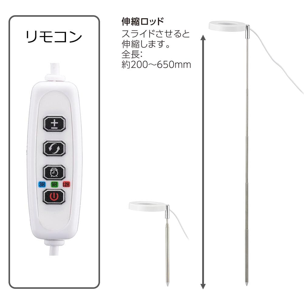 ■電源:5V 1.3A(MAX) ■消費電力:約6.5W(MAX) ■全光束:約285ルーメン(白色+暖色100%点灯時) ■エネルギー消費効率:約44 lm/W ■照度:約25000ルクス(直下2.5cm/100%点灯時)、約21700ルクス(直下5cm/100%点灯時)、約9820ルクス(直下10cm/100%点灯時)、約3070ルクス(直下20cm/100%点灯時) ■光合成光粒子束密度(PPFD):約410マイクロmol/m2・S(2.5cm/100%点灯時)、約355マイクロmol/m2・S(5cm/100%点灯時)、約160マイクロmol/m2・S(10cm/100%点灯時)、約50マイクロmol/m2・S(20cm/100%点灯時) ■平均演色評価数:Ra90 ■使用光源:白色LED・暖色LED(交換不可) ■推奨照射距離:約5-10cm ■調光機能:10段階(100%→90%→80%→70%→60%→50%→40%→30%→20%→10%) ■タイマー機能:3段階(3・9・12時間) ■使用温度範囲:-10~40℃ ■保護等級:IPX3 ※ JIS/IEC保護等級(JISC0920:2003)…鉛直より60度からの水に対して保護する(定義…鉛直より60度からの水によっても有害な影響を及ぼしてはならない。) ■本体寸法:ヘッド…(約)最大径90mm、伸縮ロッド…(約)最大径8×高さ200mm(最大650mm) ■本体質量:約105g ■付属品:保証書