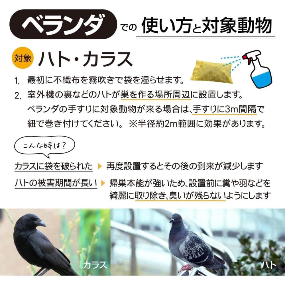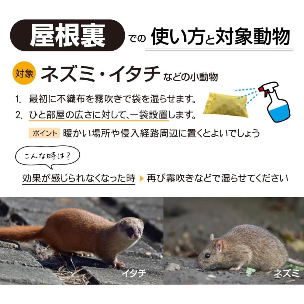効果のある対象動物 猪・鹿・ハクビシン・イタチ・ネズミ・タヌキ・キツネ・カラス・鳩・モグラ 他 効果がほとんど見られないない動物 犬・猫・猿・熊・アナグマ・アライグマ・ヒヨドリ・ムクドリ