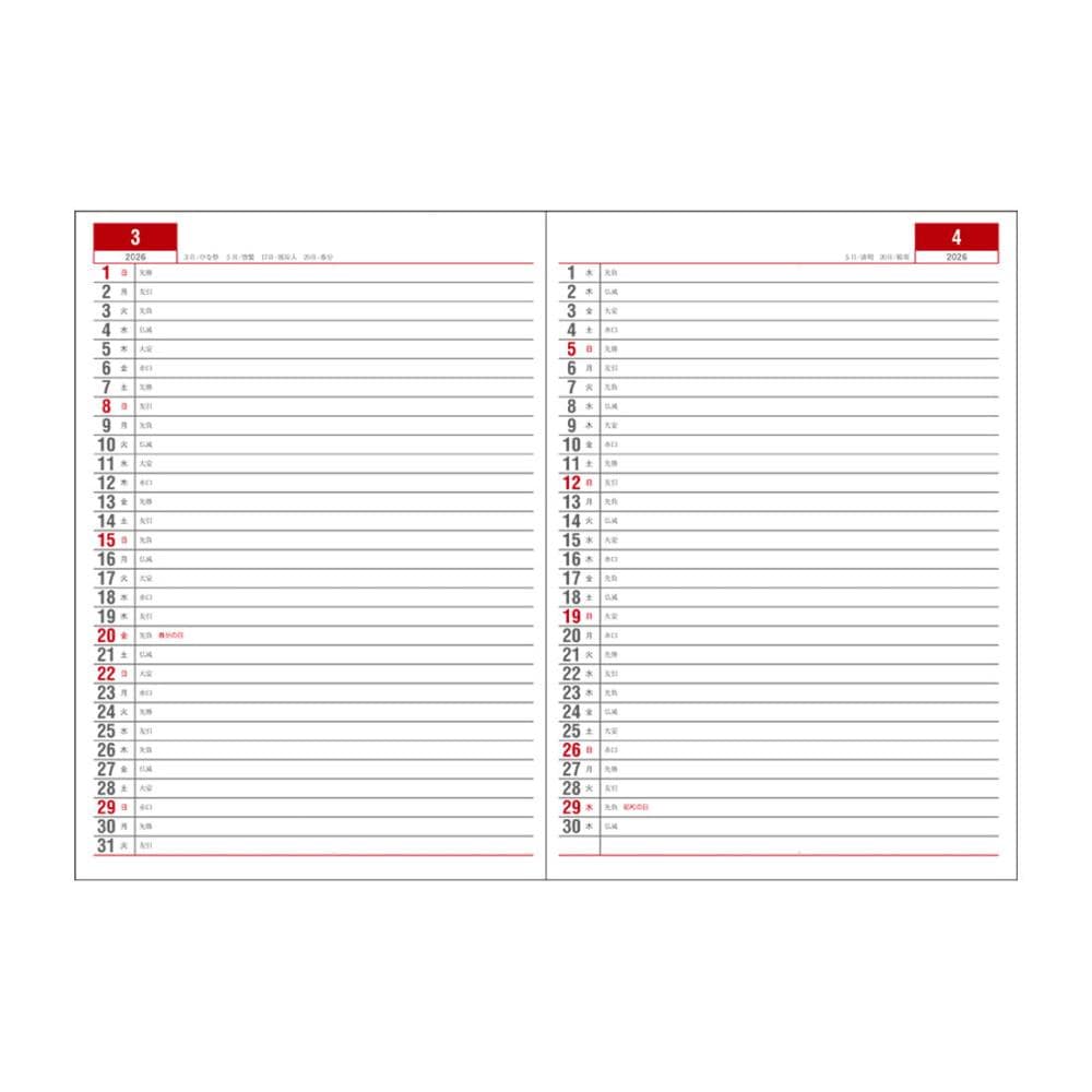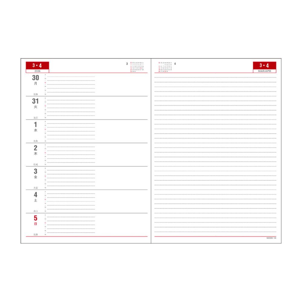 左半分が1週間のスケジュール、右半分が横罫のメモスペースになっており1週間の予定とメモを見開きで管理できる人気のレイアウトです。1週間の予定をざっくり把握したい、フリースペースにメモを取りたい人におすすめです。