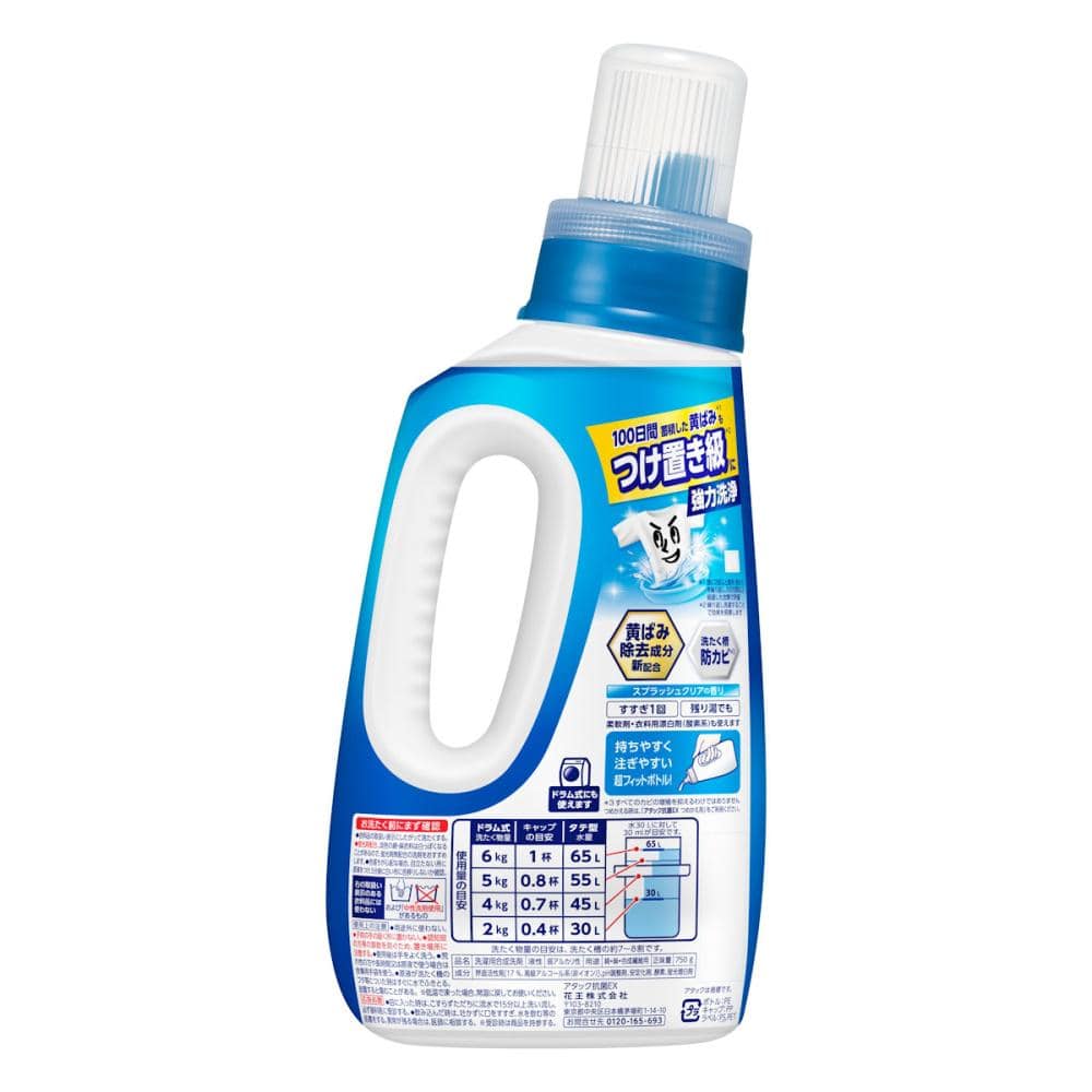 100日間蓄積した黄ばみ*1もつけ置き級*2に強力洗浄。黄ばみ除去成分新配合 ■洗濯槽防カビ*3 ■24時間ずーっと抗菌*3 ■柔軟剤・衣料用漂白剤(酸素系)も使えます ■すすぎ1回OK ■スプラッシュクリアの香り *1週に2回以上着用・洗濯を繰り返し、100日間以上経過した衣類で評価 *2繰り返し洗濯することで効果を発揮します *3すべての菌・カビの増殖を抑えるわけではありません