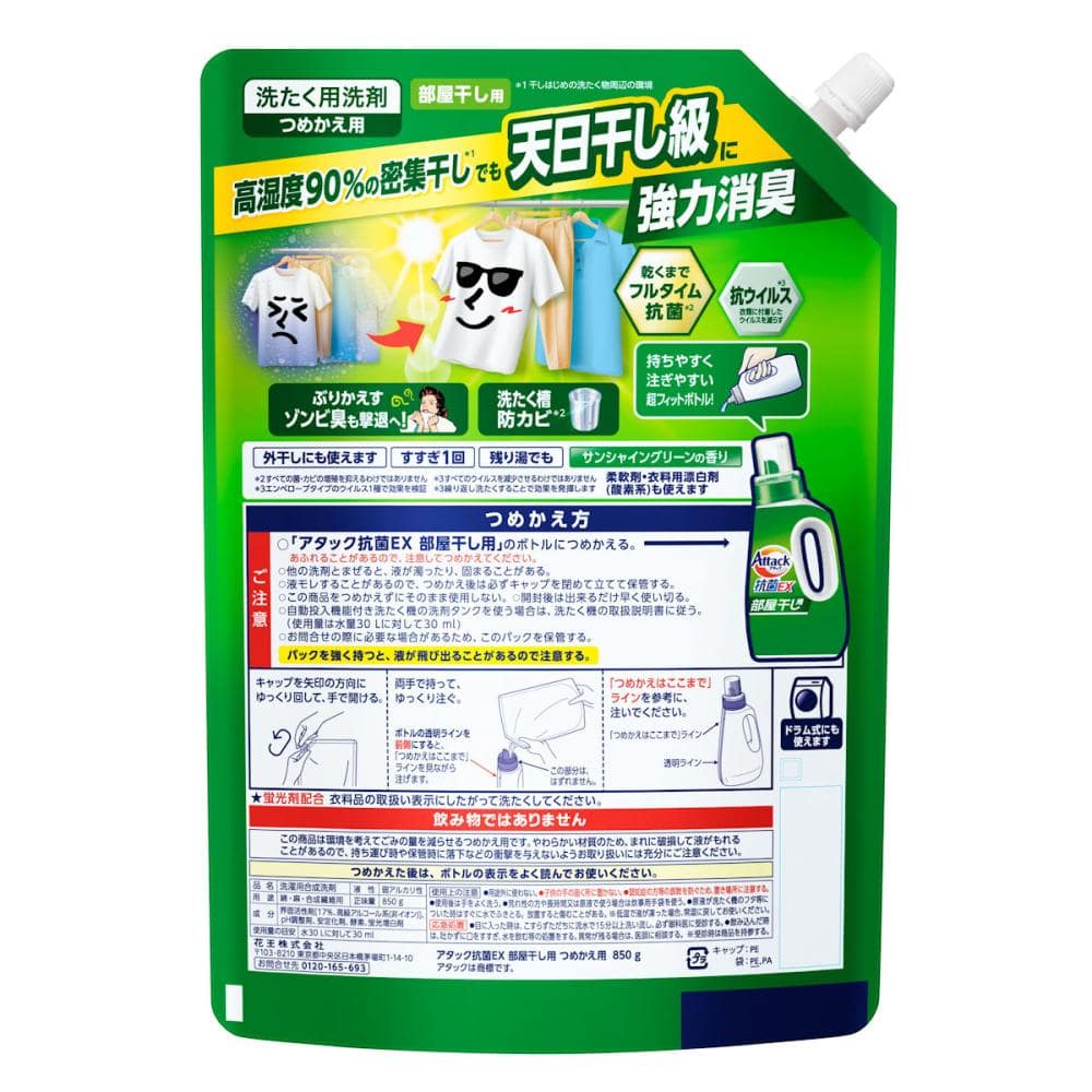 使用上の注意:○「アタック抗菌EX 部屋干し用」のボトルにつめかえる。あふれることがあるので、注意してつめかえてください。 ○他の洗剤とまぜると、液が濁ったり、固まることがある。 ○液モレすることがあるので、つめかえ後は必ずキャップを閉めて立てて保管する。 ○この商品をつめかえずにそのまま使用しない。 ○開封後は出来るだけ早く使い切る。 ○自動投入機能付き洗たく機の洗剤タンクを使う場合は、洗たく機の取扱説明書に従う。(使用量は水量30Lに対して30mL) ○お問合せの際に必要な場合があるため、このパックを保管する。 パックを強く持つと、液が飛び出ることがあるので注意する。 使用上の注意 ●用途外に使わない。 ●子供の手の届く所に置かない。 ●認知症の方等の誤飲を防ぐため、置き場所に注意する。 ●使用後は手をよく洗う。 ●荒れ性の方や長時間又は原液で使う場合は炊事用手袋を使う。 ●原液が洗たく機のフタ等についた時はすぐに水でふきとる。放置すると傷むことがある。 ※低温で液が凍った場合、常温に戻してお使いください。