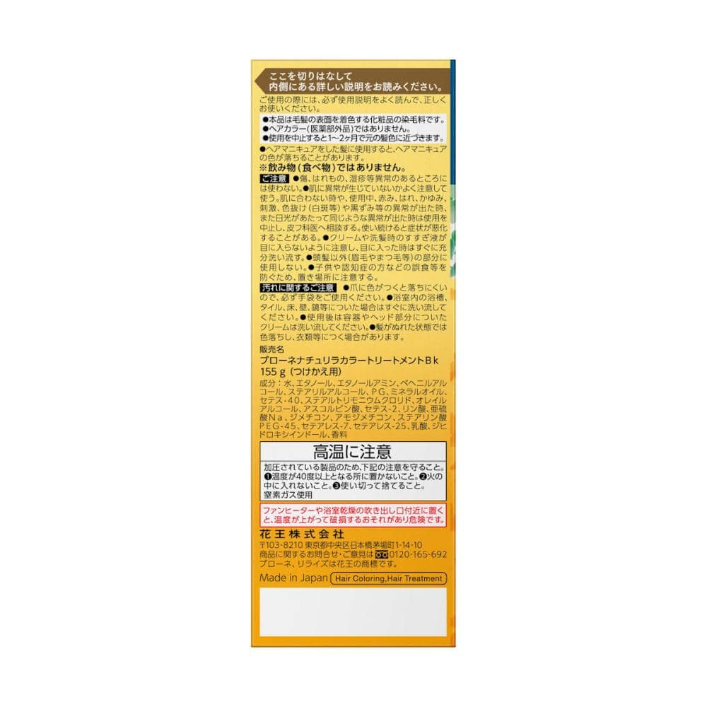原材料・成分:水、エタノール、エタノールアミン、ベヘニルアルコール、ステアリルアルコール、PG、ミネラルオイル、セテス-40、ステアルトリモニウムクロリド、オレイルアルコール、アスコルビン酸、セテス-2、リン酸、亜硫酸Na、ジメチコン、アモジメチコン、ステアリン酸PEG-45、セテアレス-7、セテアレス-25、乳酸、ジヒドロキシインドール、香料