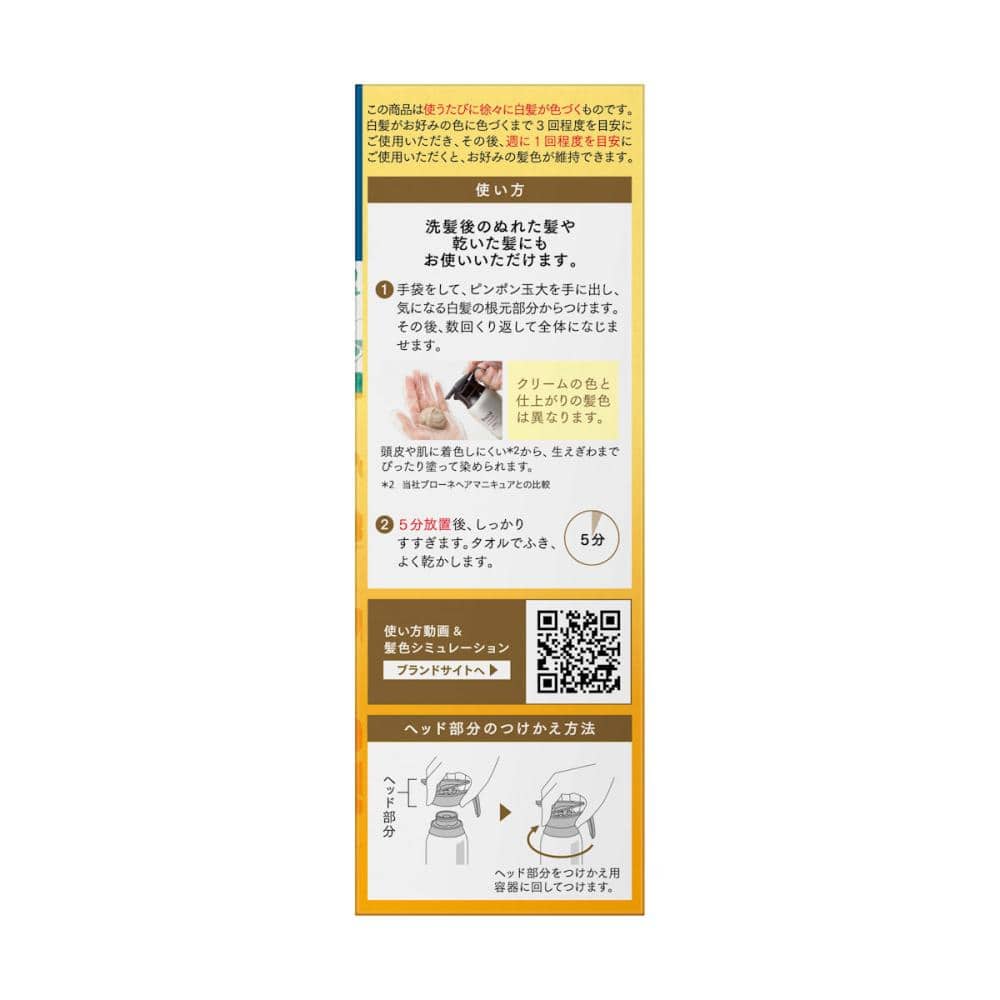 商品の利用(調理)方法:洗髪後のぬれた髪や乾いた髪にもお使いいただけます。 1.手袋をして、ピンポン玉大を手に出し、気になる白髪の根元部分からつけます。 その後、数回くり返して全体になじませます。 クリームの色と仕上がりの髪色は異なります。 頭皮や肌に着色しにくい*2から、生えぎわまでぴったり塗って染められます。 *2 当社ブローネヘアマニキュアとの比較 2.5分放置後、しっかりすすぎます。 タオルでふき、よく乾かします。