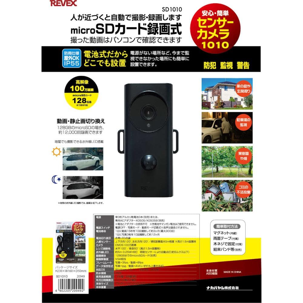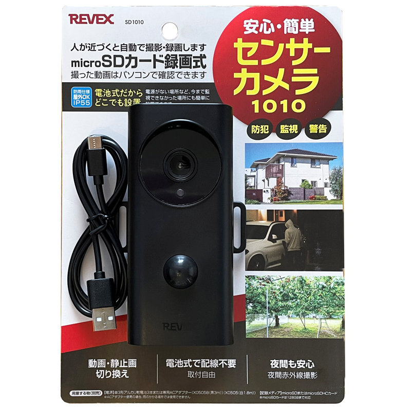 ・ゴミの不法投棄対策に ・侵入者対策に ・ストーカー対策に ・農作物荒らし対策に ・車上荒らし対策に <特徴> ・電池式だからどこにでも設置できます。 ・最大100万画素の録画が可能です。 ・最大128GBまでのmicroSDカードに対応しています。 ・夜間でも赤外線LEDで録画します。 ・動画モード・静止画モードを選べます。 ・撮った画像はパソコンで確認できます。 ・屋外でも使用可能です(IP55) <製品仕様> ・電源:単3形アルカリ電池3本(別売)、又は、別売ACアダプター X0505(白1.8m)/X0505B(黒3m) ・電池寿命:動画(15秒)を1日10回録画して約3カ月(夜間撮影が多い場合は赤外線LED点灯のため短くなります) ・録画媒体:128GBまでのmicroSDカード(別売) ・カメラ:CMOS-最大100万画素 ・液晶画面:なし ・動画撮影時間:15秒 素材・材質:ABS樹脂 生産国:中国